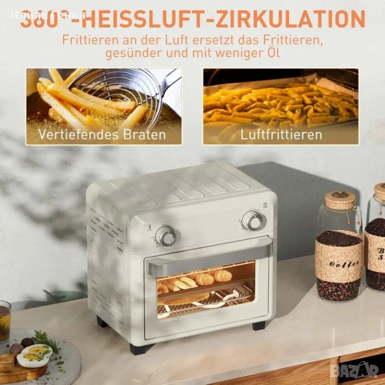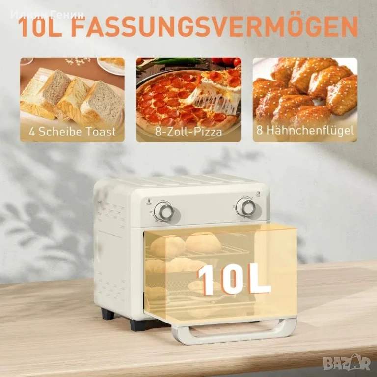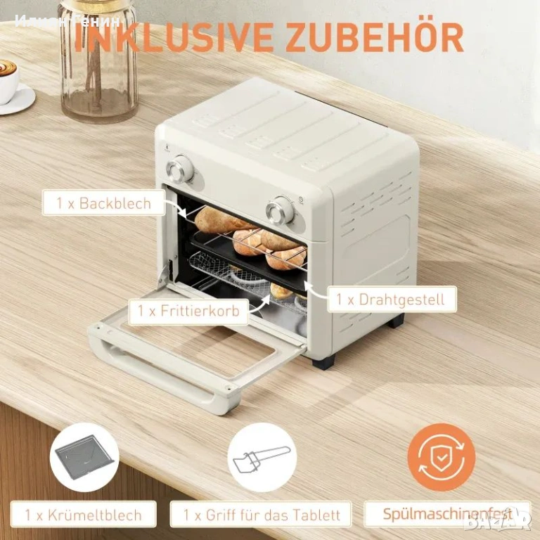 Фурна с горещ въздух HOMCOM 10L за гриловане, печене и пържене, таймер, 1000W, подходяща за съдомиялна машина, кремаво бяла - 65.00 €.
