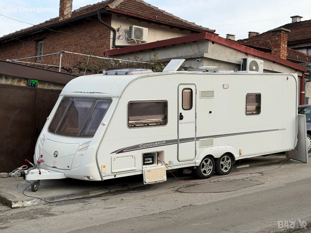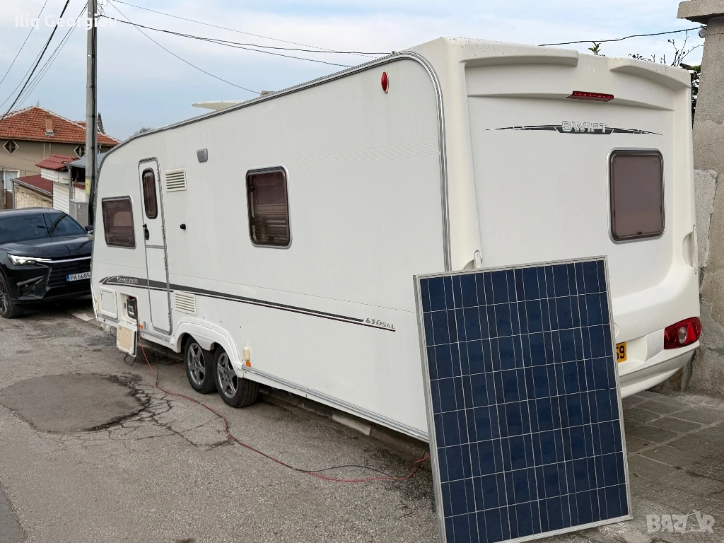 SWIFT CONQUEROR 630sal-Двуосна 4/5 местна КАТО НОВА, СОЛАР, ФОРСЕЛТ, ДУШ КАБИНА, MOTOR MOVER, ТЯГОВ АКОМУЛАТОР, ATC-СИСТЕМА ЗА ПОДНАСЯНЕ , ГОЛЯМ ХЛАДИЛНИК, TEЛЕВИЗОР с въртяща се стойка, LED ОСВЕТЛЕНИЕ/ВЪТРЕШЕН РЕЗЕРВОАР/ХИДРОФОРНА СИСТЕМА с много силно налягане/ ДУШ КАБИНА -отделно от тоалетната, МИКРОВЪЛНОВА ФУРНА, ПЪЛНО КУХНЕНСКО ОБОРУДВАНЕ, ДЪЛГИ ПРЕДНИ ДИВАНИ, ЕЛЕКТРИЧЕСКО УПРАВЛЕНИЕ, Електрически вентилатор на едната страна духа, на другата дърпа като абсурбатор, Локър за заключване на теглича и на гумата, аларма, led осветление/амбиентно осветление отпред, дъска за рязане, газовa бутилкa, ключ за стабилизиращите лапи, стъкла със слънчезащитна изолация, резервоар за чиста вода със стойка, резервоар за отходните води с колела, голям шибидах отпред и над фиксираната спалня, един по малък по средата и един в банята, комарник на врата, щори и комарници на всички прозорци ХАРМОНИКА, новата система на thetford, тоалетна чиния с въртяща се глава, Душ кабина, ГОЛЯМ хладилник с голяма камера в горния край който работи на 220v, 12v и газ, отоплителна ПЕЧКА TRUMAна газ и 220v), 4 котлона за готвене на 3 на газ и 1 на 220v + фурна и грил, бойлера работи на 220v и газ , сензор за пожар, вградено fast charger зарядно за акомулатора, химическа тоалетна от ново поколение, 2 маси, минибар, нови гуми, антивиброационен теглич, антена с усилвател, табло за управление, индикатор за заряда на акомулатора, бърза връзка за вода(помпа), бърза връзка за вода с възможност за свързване към стационарна мрежа, кабел за включване в 220v стабилизатори за гумите, 220v инсталация и много други. . . Готова за къмпингуване. Топ състояние! В предния край диваните стават на голяма спалня 2. 20/2. 00м, Отстрани ГОЛЯМА ФРЕНСКА СПАЛНЯ, Мокрото помещение най отзад душ кабина и тоалетната отделно. УНИКАЛНО РАЗПОЛОЖЕНИЕ. Караваната в основата си е покрита с оригиналния си балатум много удобна и лесна за почистване. Разделителна врата която разделя предната спалня от страничната френска спалня, мокрото помещение също е отделено с масивна врата -ОБЩО 3 помещения. Много практично и удобно разположение което позволява на голямо семейство да се разположи + обемния гардероб , кухненско оборудване, спално бельо, аларма, дизайн на интериора с заоблени детайли, 3ти стоп, CD PLAYER, TV, Аларма, сензор за дим. Луксозен дизайн, Готова за къмпингуване! ! ! ИЗПРАНА!