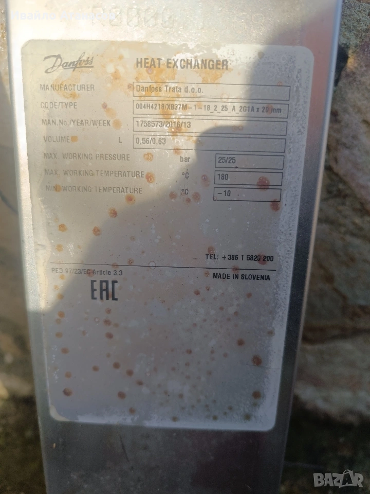 пластинчат топлообменник Danfoss, модел XB37M-1. Изключително ефективен благодарение на патентованата MicroPlate™ технология. Подходящ за системи за БГВ, отопление и климатизация. Технически спецификации: - Код на продукта: 004H4218 - Брой пластини: 18 - Тип на пластините: M (Medium) - балансиран профил за оптимален топлообмен и налягане - Материал на пластините: Неръждаема стомана (AISI 316L) - Присъединяване: Външна резба G 1" A - Дължина на връзките: 20 mm - Работно налягане (PN): 25 bar (Максимално) - Работна температура: от -10°C до +180°C - Обем на канал: 0.101 литра - Площ на топлообмен: 0.880 m² - Производител: Danfoss Trata d.o.o. Състояние: Използван.