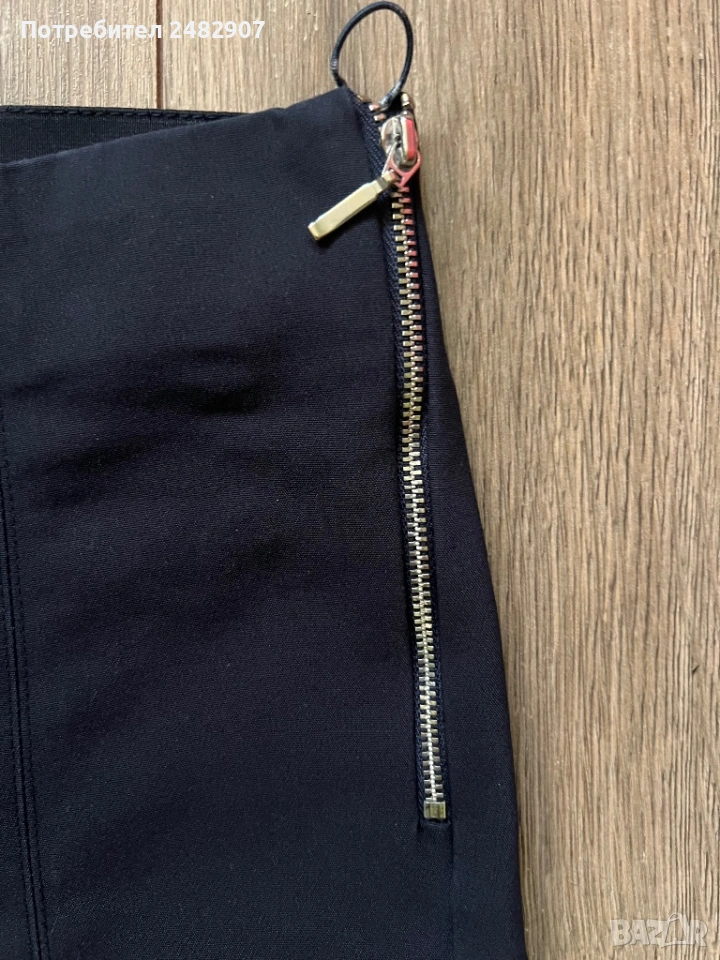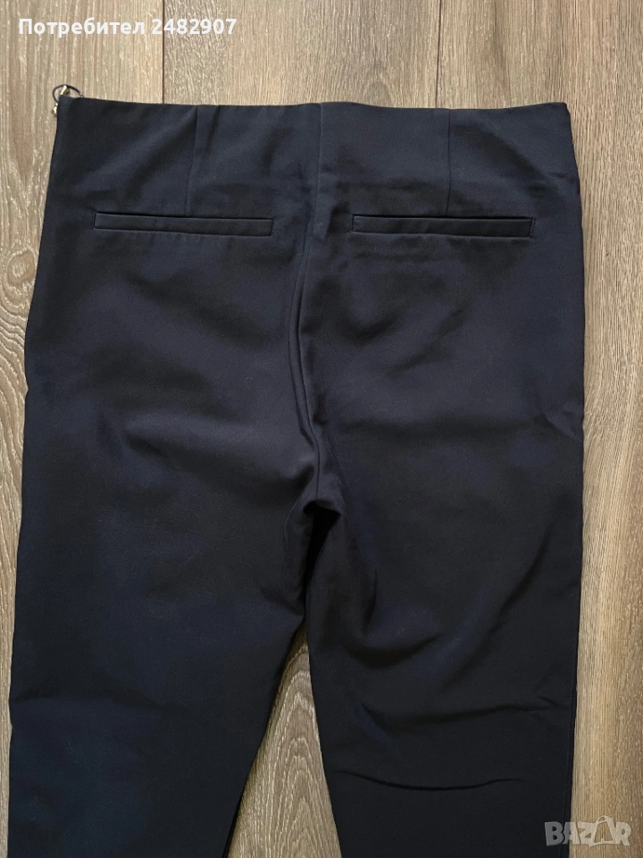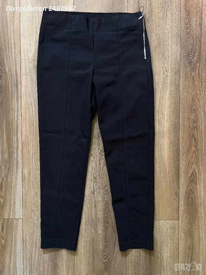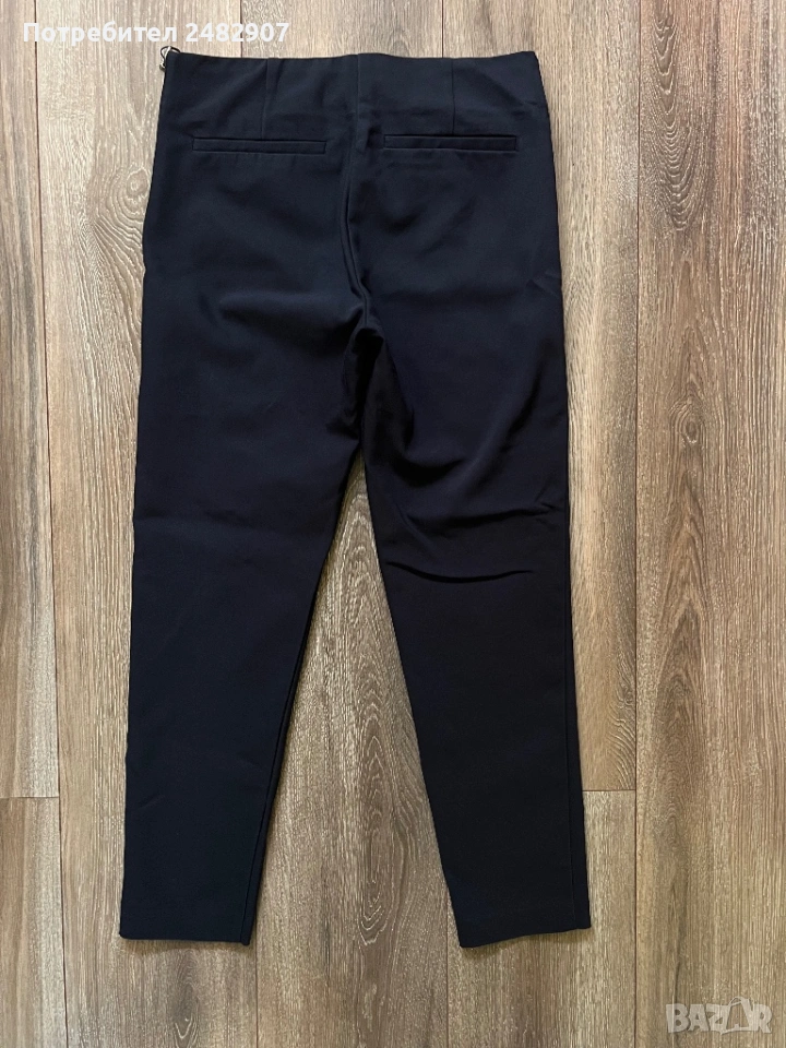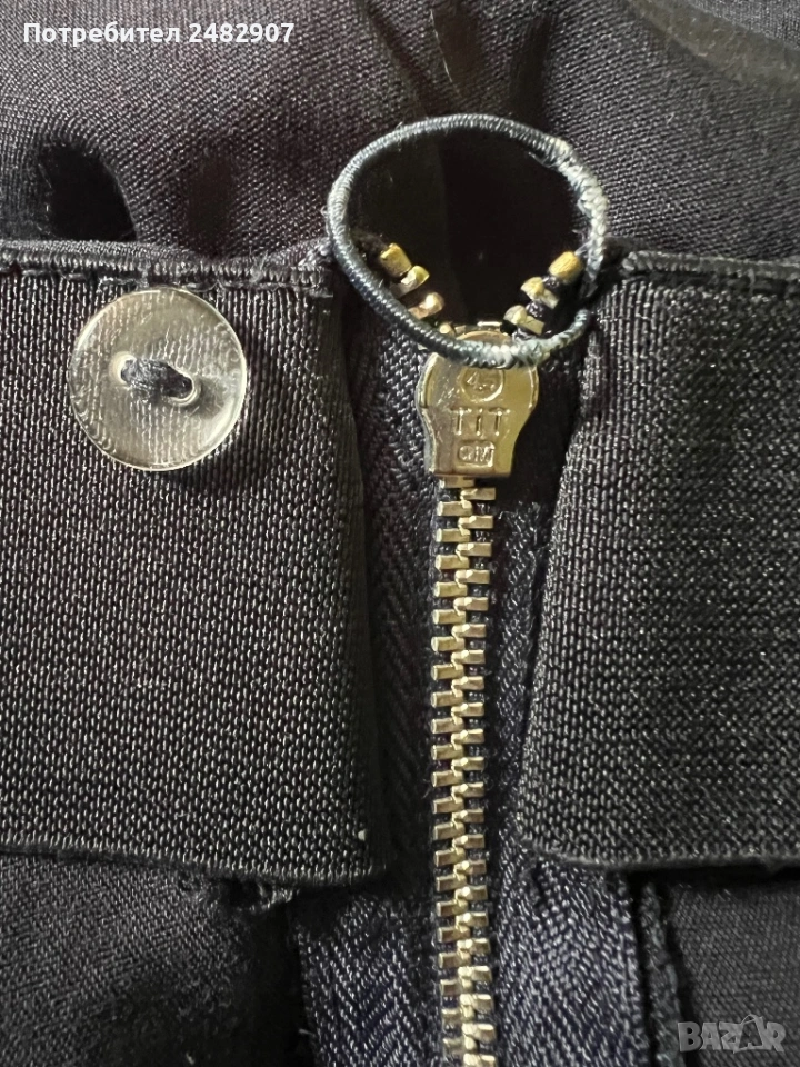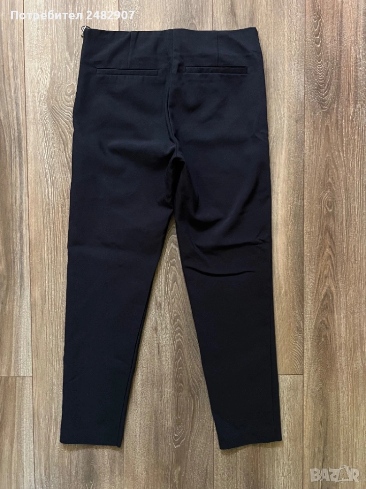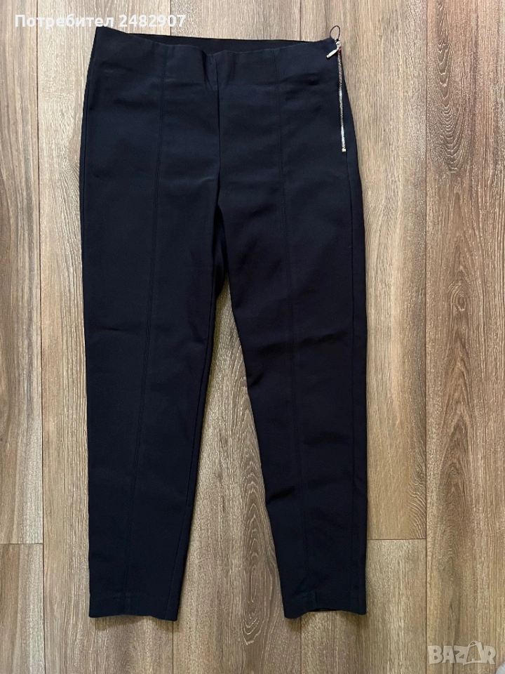 Тъмно син дамски панталон със страничен цип отляво, размер 38. Съдържа 54 % памук, 42 % полиестер и 4 % еластан. Ширина в талията - 36 см, дължина от талията до чатала - 22,5 см, дължина от талията до долу - 86 см, ширина на крачола в долната част - 14 см, дължина на ципа - 16 см. Много запазен, почти не е използван, леко еластичен, с ластик и копче в талията.