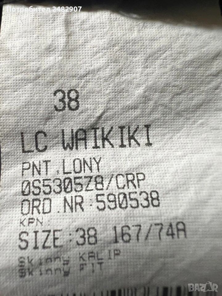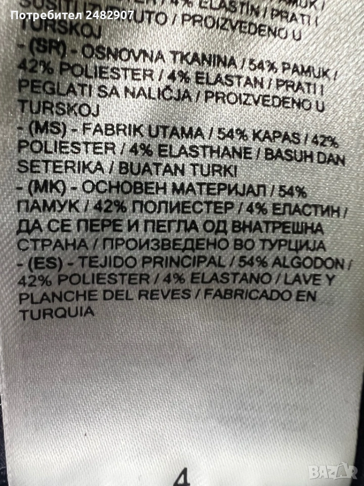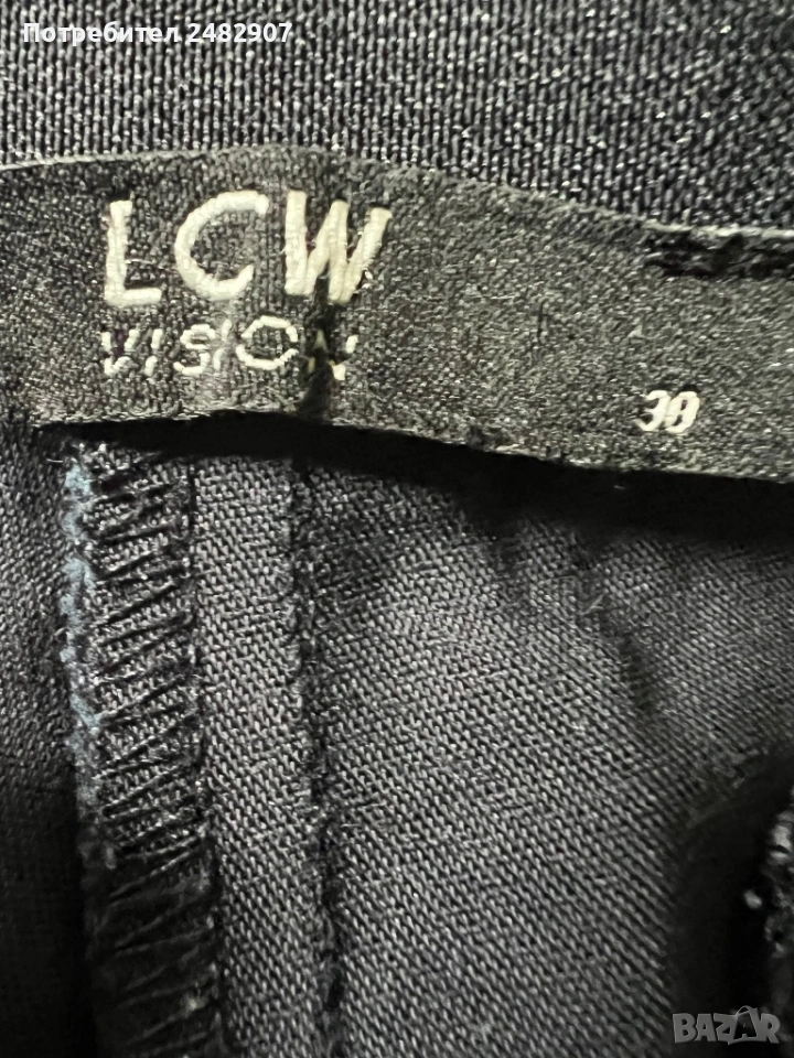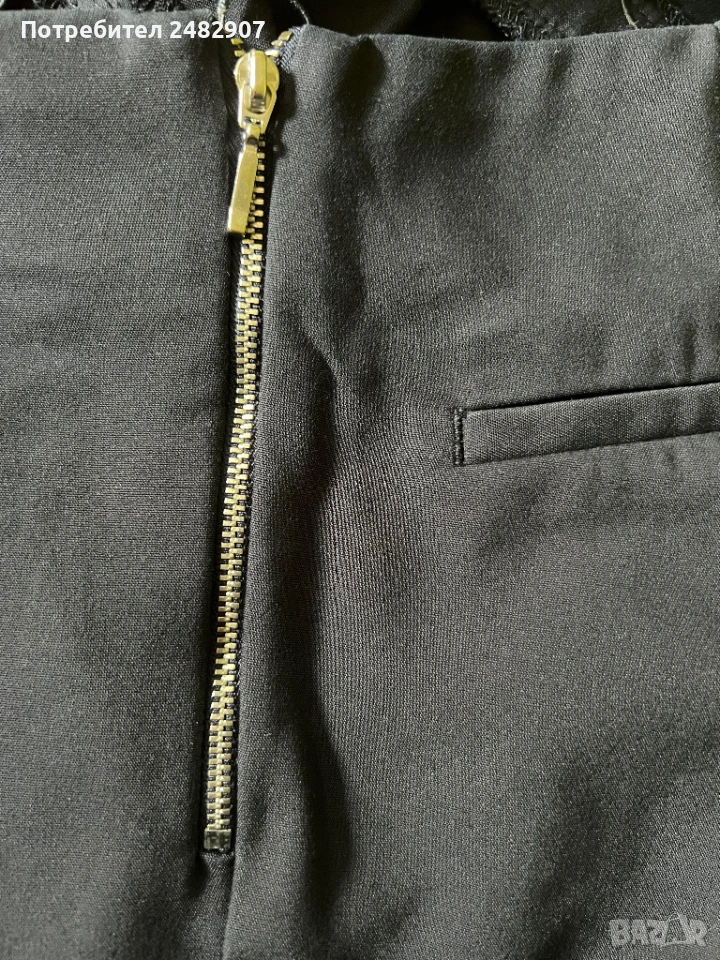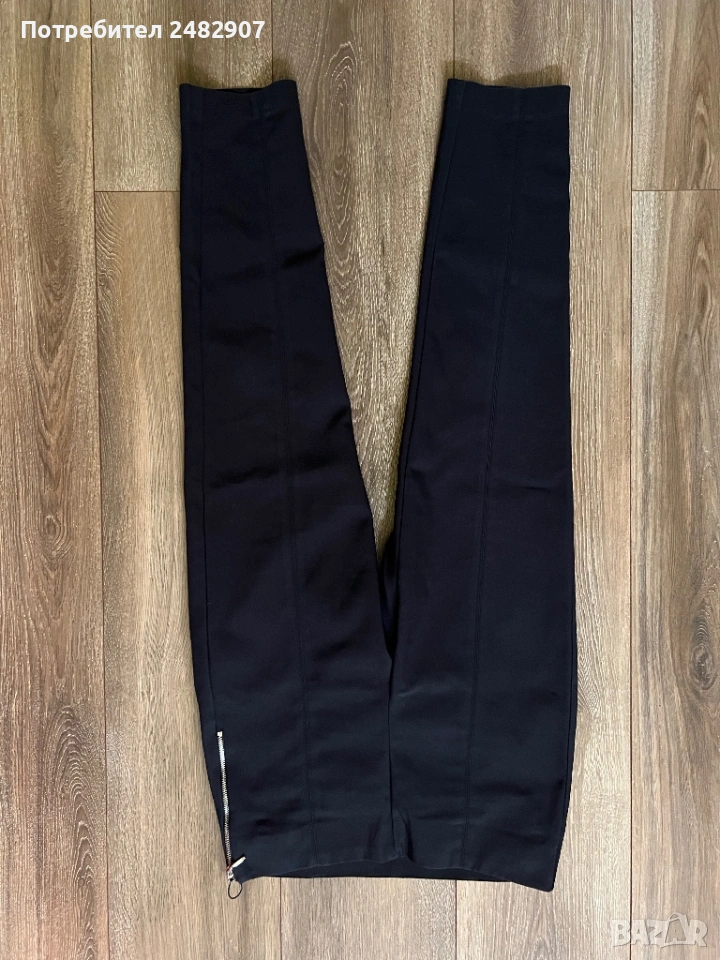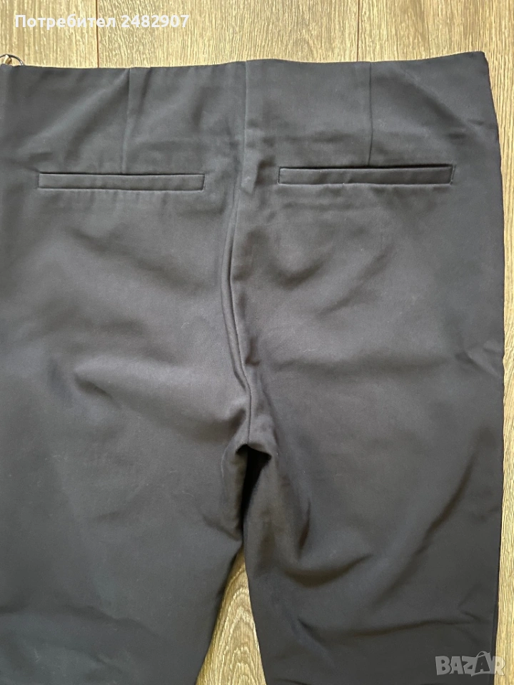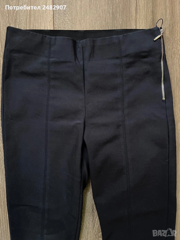 Тъмно син дамски панталон със страничен цип отляво, размер 38. Съдържа 54 % памук, 42 % полиестер и 4 % еластан. Ширина в талията - 36 см, дължина от талията до чатала - 22,5 см, дължина от талията до долу - 86 см, ширина на крачола в долната част - 14 см, дължина на ципа - 16 см. Много запазен, почти не е използван, леко еластичен, с ластик и копче в талията.