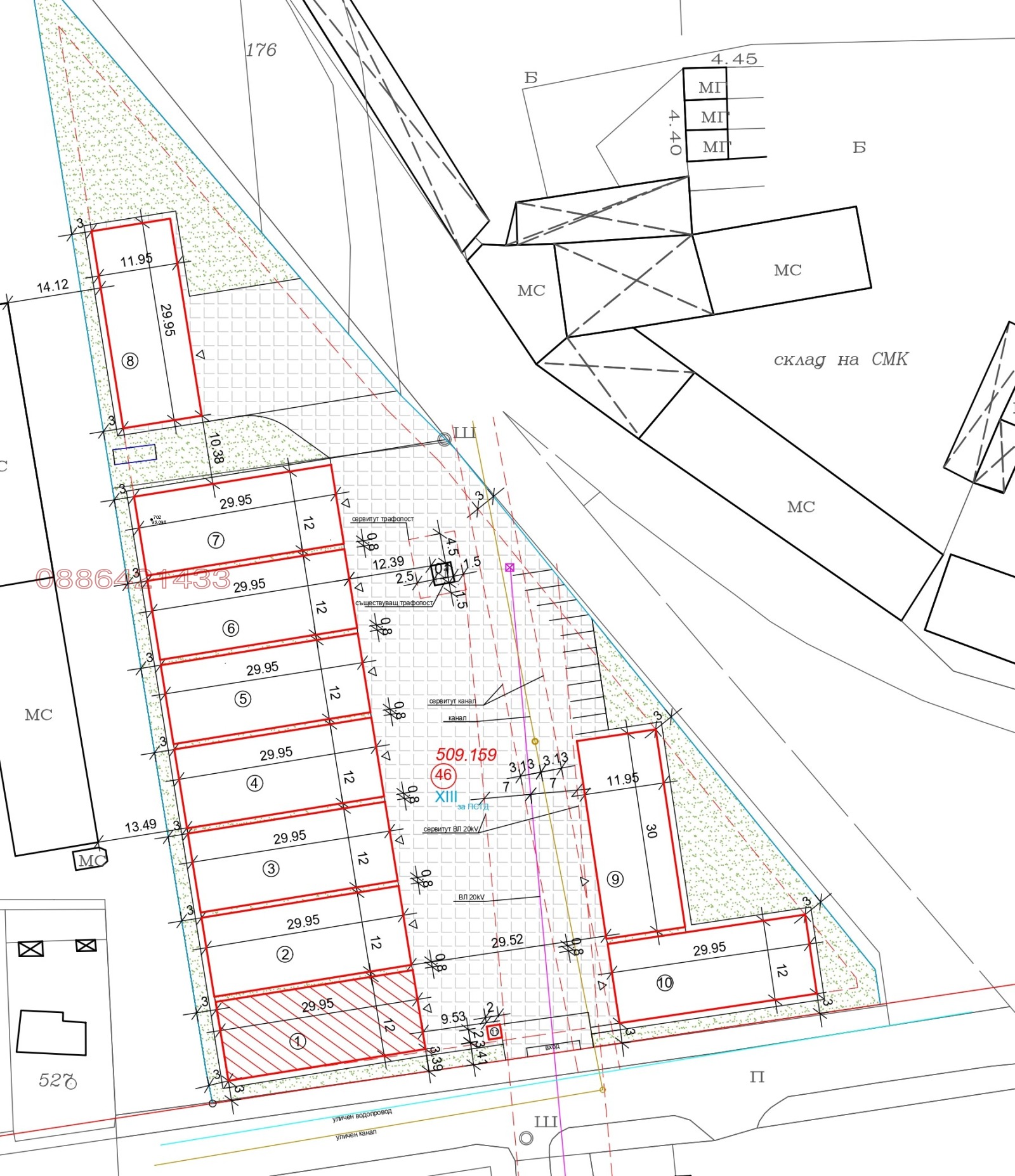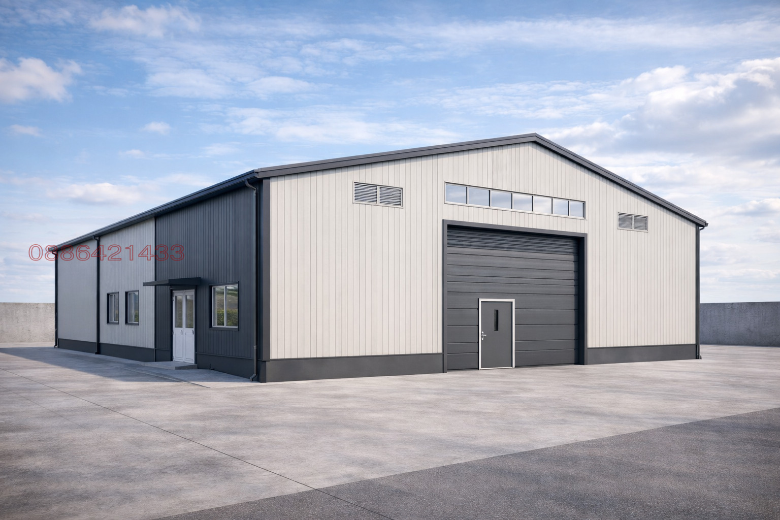 Площ на хале: 360 кв.м + 570 кв.м Идеални площи общо 930кв