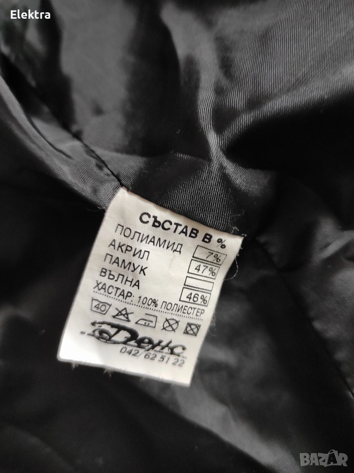 Палто на модна къща Денс. По тяхна номерация е номер 46. Съдържа 46% вълна, което го прави подходящо, както за по-мека зима, така и за ранна пролет. Носено е малко, няма забележки.
