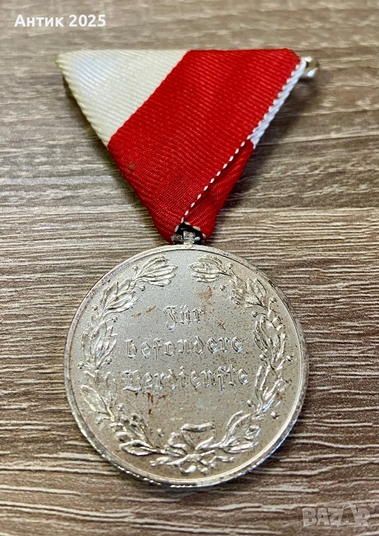 • Обратна страна (реверс): Лавров венец с надпис на немски: „Für besondere Verdienste“ (За особени заслуги).