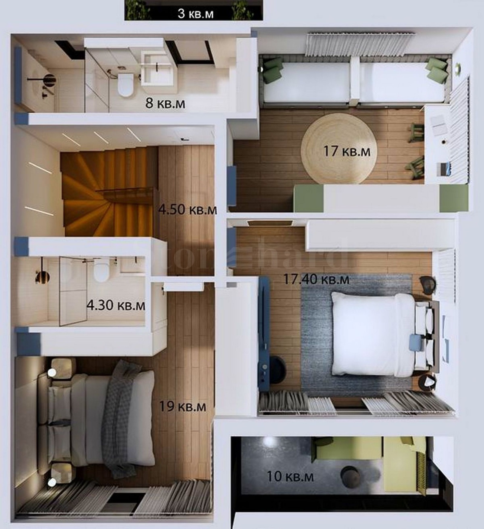 Всяка къща е двуетажна, с функционално вътрешно разпределение и удобно вътрешно стълбище, с обща жилищна площ от 204 кв.м /без подпокривното пространство/. Сградите са проектирани със скатен покрив с керемиди, който допълва елегантната визия и подчертава усещането за стил и устойчивост във времето.
