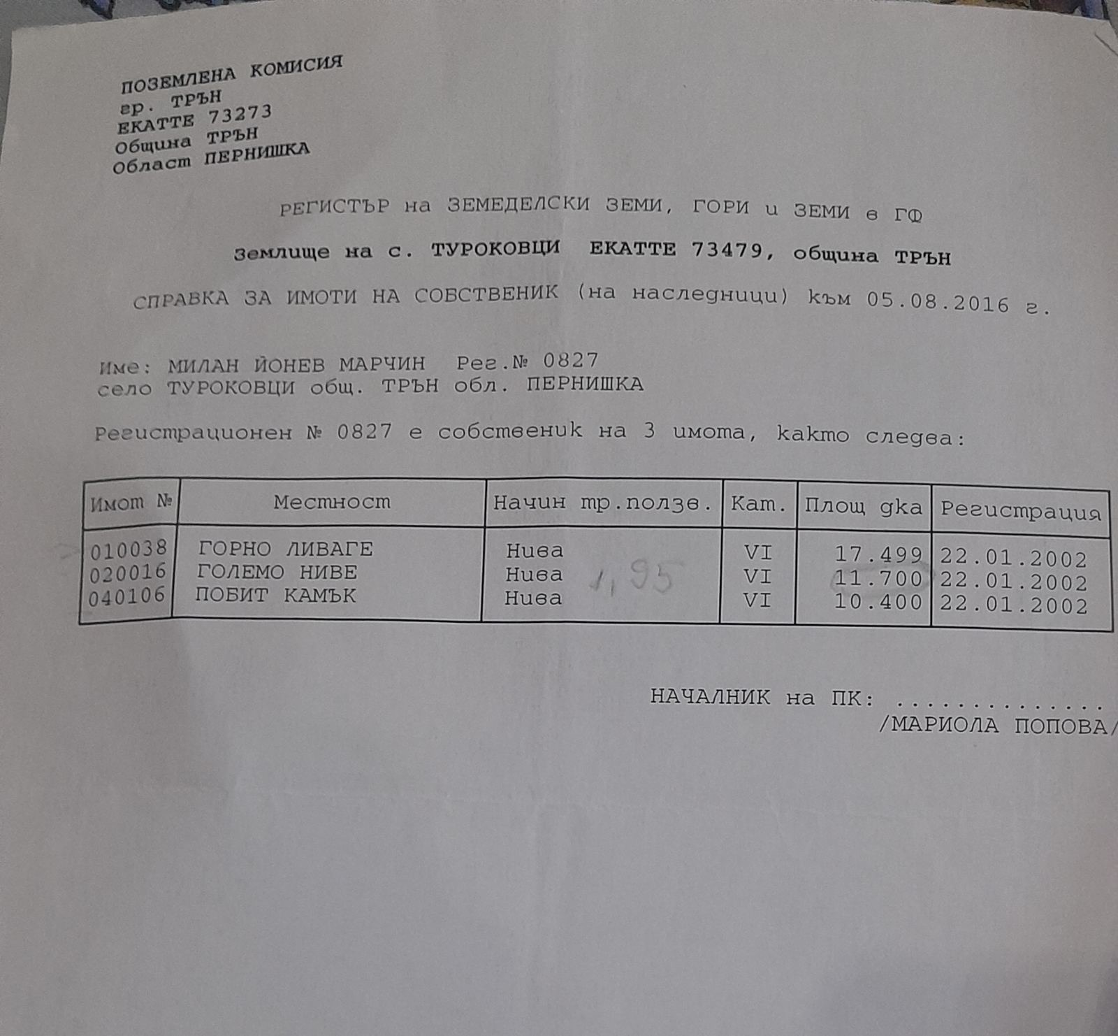 Имотите са собственост на Милан Йонев Марчин (рег. 0827), съгласно справка към 05.08.2016 г.