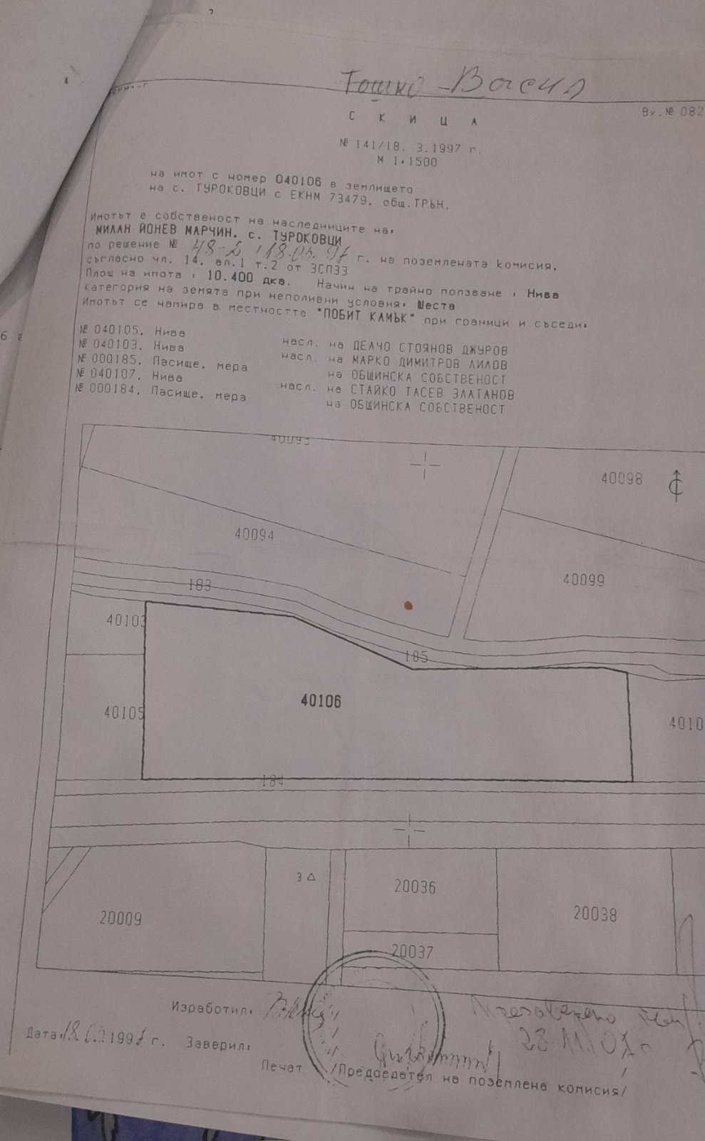 3. Имот 040106, местност Бит Камък нива, VI категория, площ 10.400 дка.