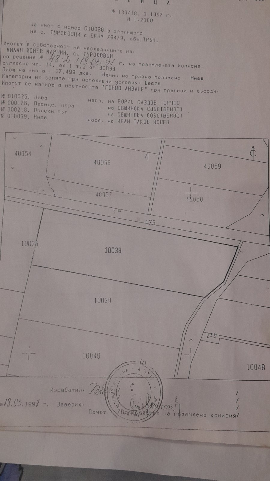 1. Имот 010038, местност Горно Ливаже нива, VI категория, площ 17.499 дка.