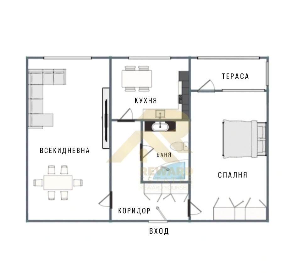 Разпределението включва входно антре, светла всекидневна, самостоятелна кухня, спалня и тераса. Пространството е добре организирано и позволява лесно преустройство в тристаен апартамент според нуждите на бъдещите собственици.