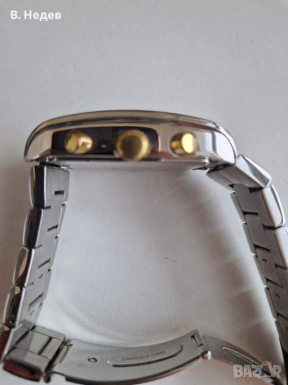 Хронографа засича от бутона - на 2 часа и от там се спира; с бутона - на 4 часа се нулира. Всичко действа безотказно и прецизно; Централната секундарна стрелка е активирана постоянно.