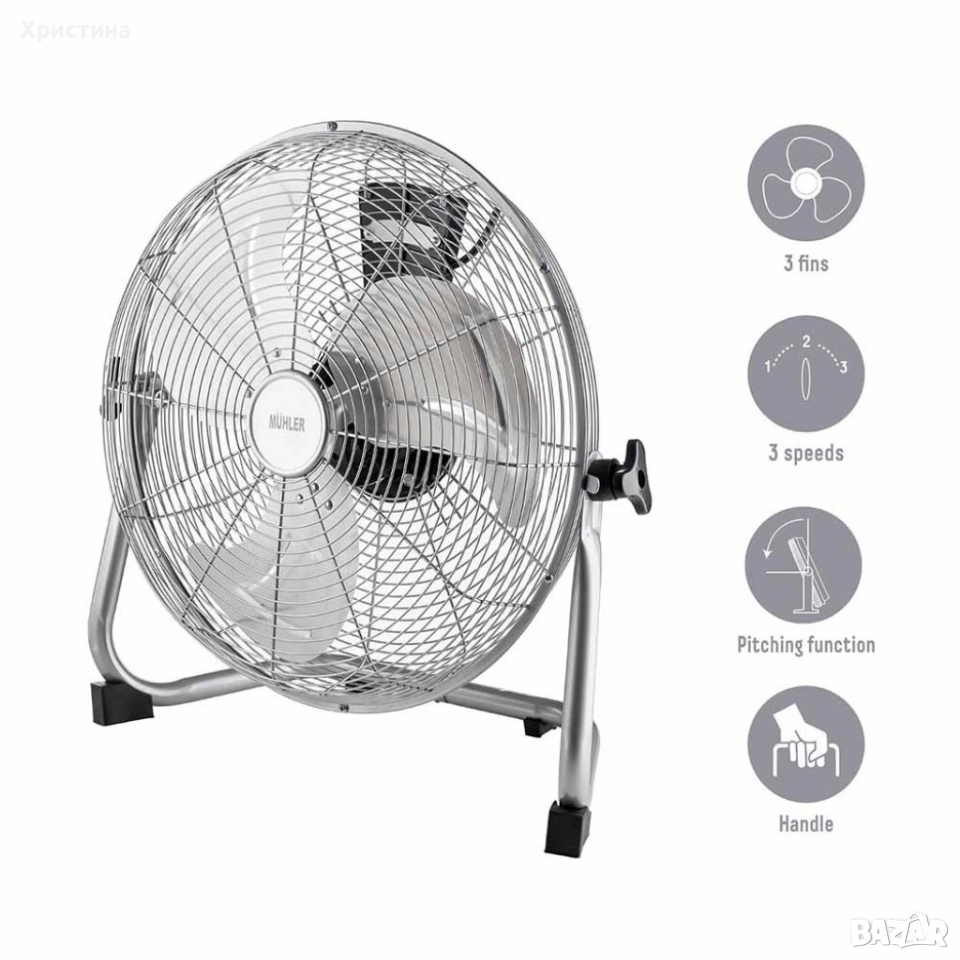 14 инча: Компактен и мощен, идеален за по-малки индустриални пространства или персонални работни места. 16 инча: Среден размер, подходящ за офиси, работилници и средно големи помещения. 18 инча: Подходящ за по-големи пространства, като осигурява мощно и равномерно охлаждане. 20 инча: Най-големият вариант, предназначен за големи индустриални зали и производствени помещения, осигуряващ максимално ефективно охлаждане. Мощност: 60 W; Вариант 1: 14 инча ЦЕНА - 55 € ; Вариант 2: 16 инча ЦЕНА-;59 € Вариант 3: 18 инча ЦЕНА - 60 € ; Вариант 4: 20 инча ЦЕНА - 65 €; Напрежение: 220-240 V; Честота: 50-60 Hz; Степени на скоростта: 3; Перки: 3 метални перки; Предпазна решетка: Да; Подова стойка: Да;/ Дръжка: Да; Вертикално регулиране на струята: Да; Ниско ниво на шум: 55dB (A).