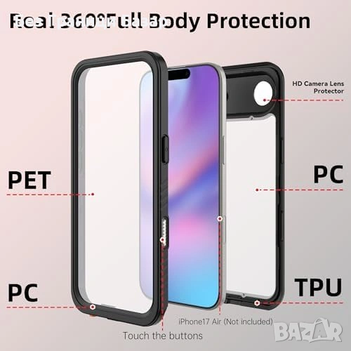 Нов Калъф iPhone 17 Air водоустойчив 360° ударо/прахоустойчив черен кейс Айфон