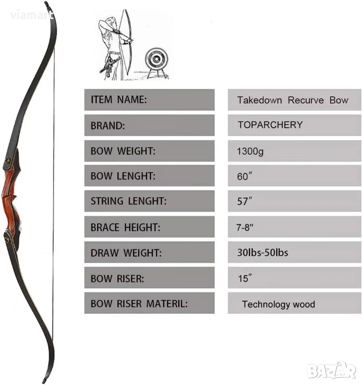 Традиционен рекърв лък Toparchery Takedown 60", Сила на опън 40 lbs → Обява 53692849