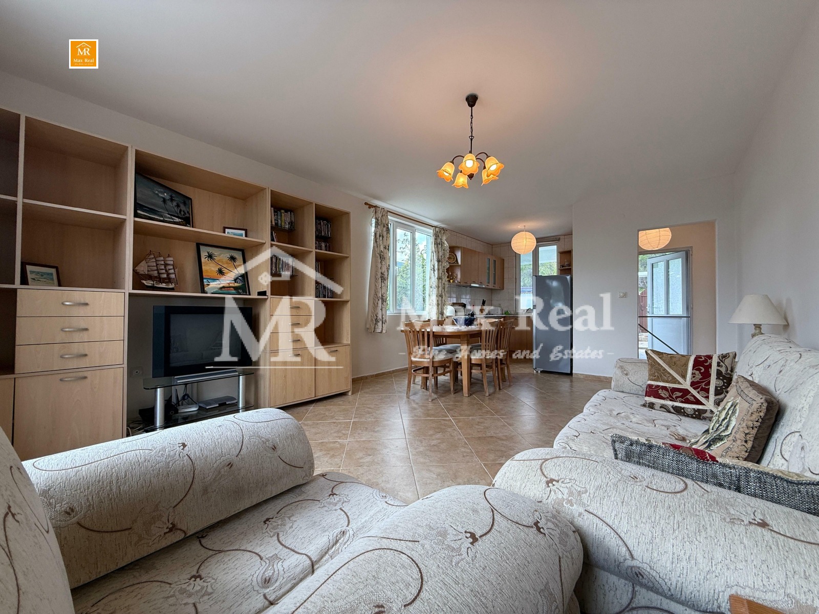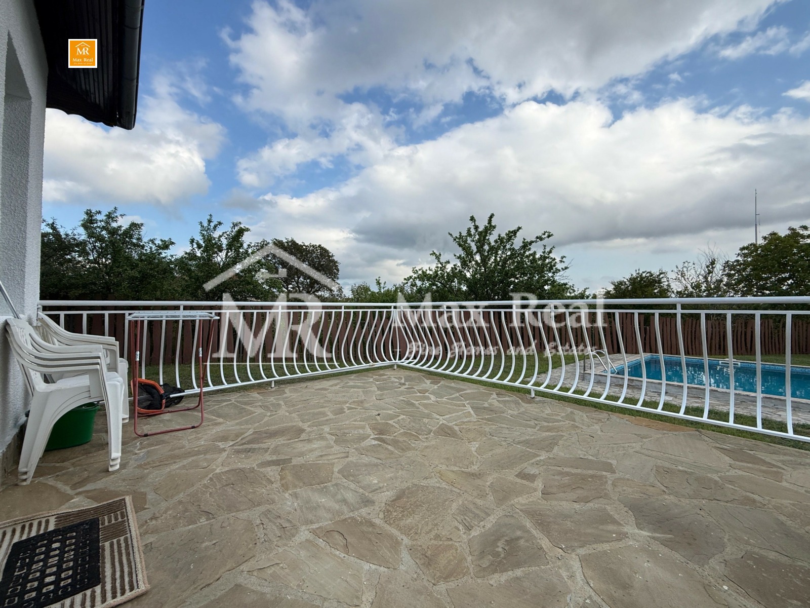Къщата е с РЗП 130 кв.м. със самостоятелен двор на площ 985 кв.м., което осигурява достатъчно пространство за добавяне на други удобства. Разпределение: коридор, просторен хол с кухня и трапезария, три спални, две бани с две тоалетни и веранда.Всички мебели са включени в цената. В двора има обособен басейн за пълноценен отдих и релакс за собствениците. Къщата има Акт 16.