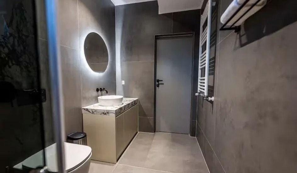 Разпределение: входно антре, кухненски бокс с хол и трапезария, спалня, две бани с тоалетна и тераса