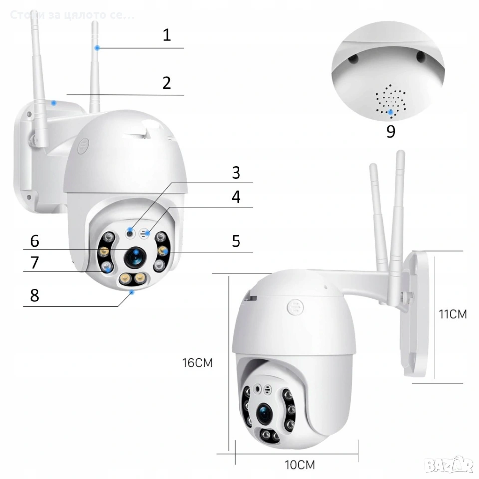 IR LED: 8 бр. с IR cut филтър, автоматичен нощен режим и цветна нощна картина