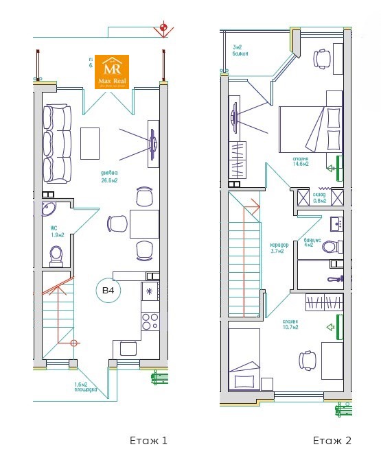 2-ри етаж: коридор, две спални, баня с тоалетна, балкон.