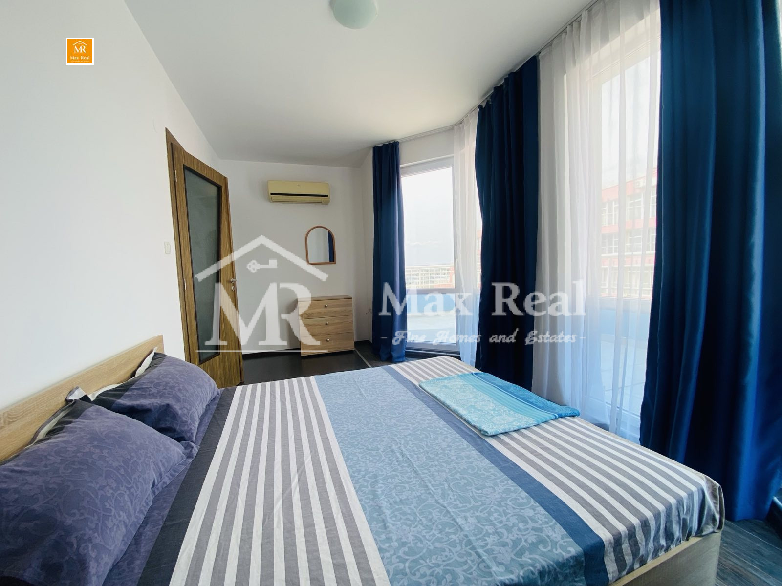 Жилището се намира на 5 етаж и се състои от коридор, 2 спални, всекидневна с кухненска част, комбиниран санитарен възел и голяма панорамна тераса. Към едната спалня има малък склад. Имотът се предлага напълно обзаведен - кухненски бокс с голям хладилник, напълно оборудвана баня с вана, климатици.