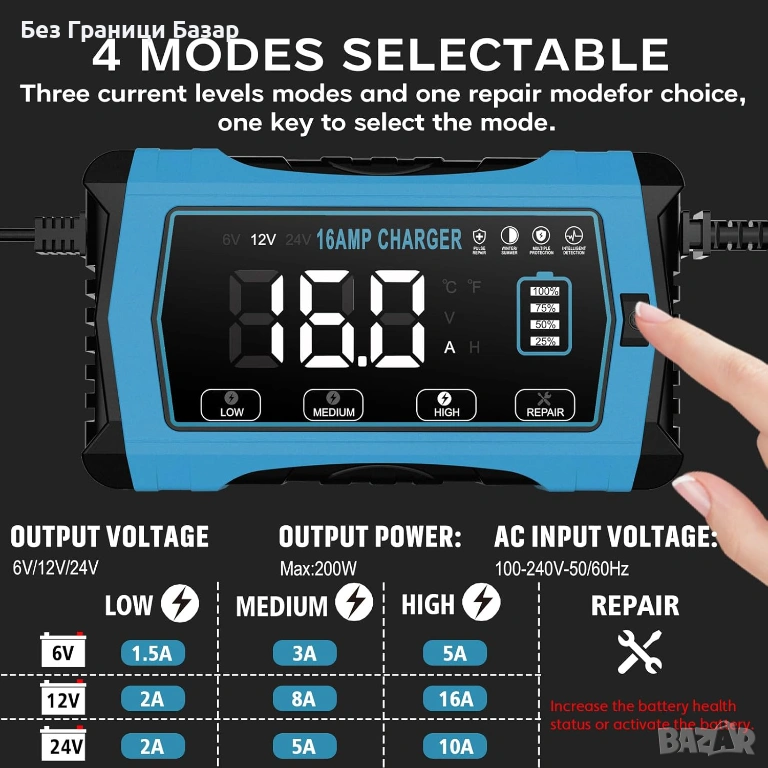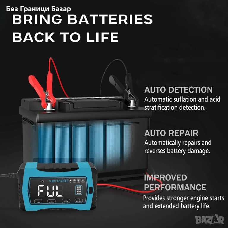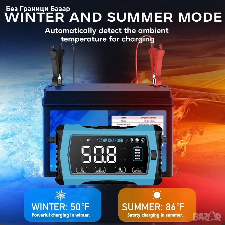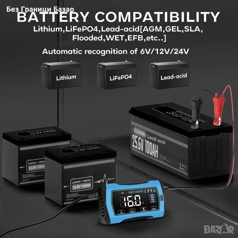 Съвместимост: оловно-киселинни (AGM, GEL, SLA, VRLA, WET, EFB, MF, Calcium) + Lithium / LiFePO4
