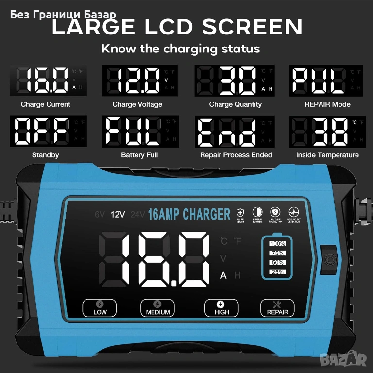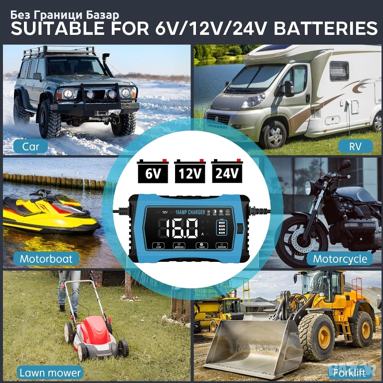 Ново Универсално зарядно за акумулатори кола мотор лодка LCD 16A