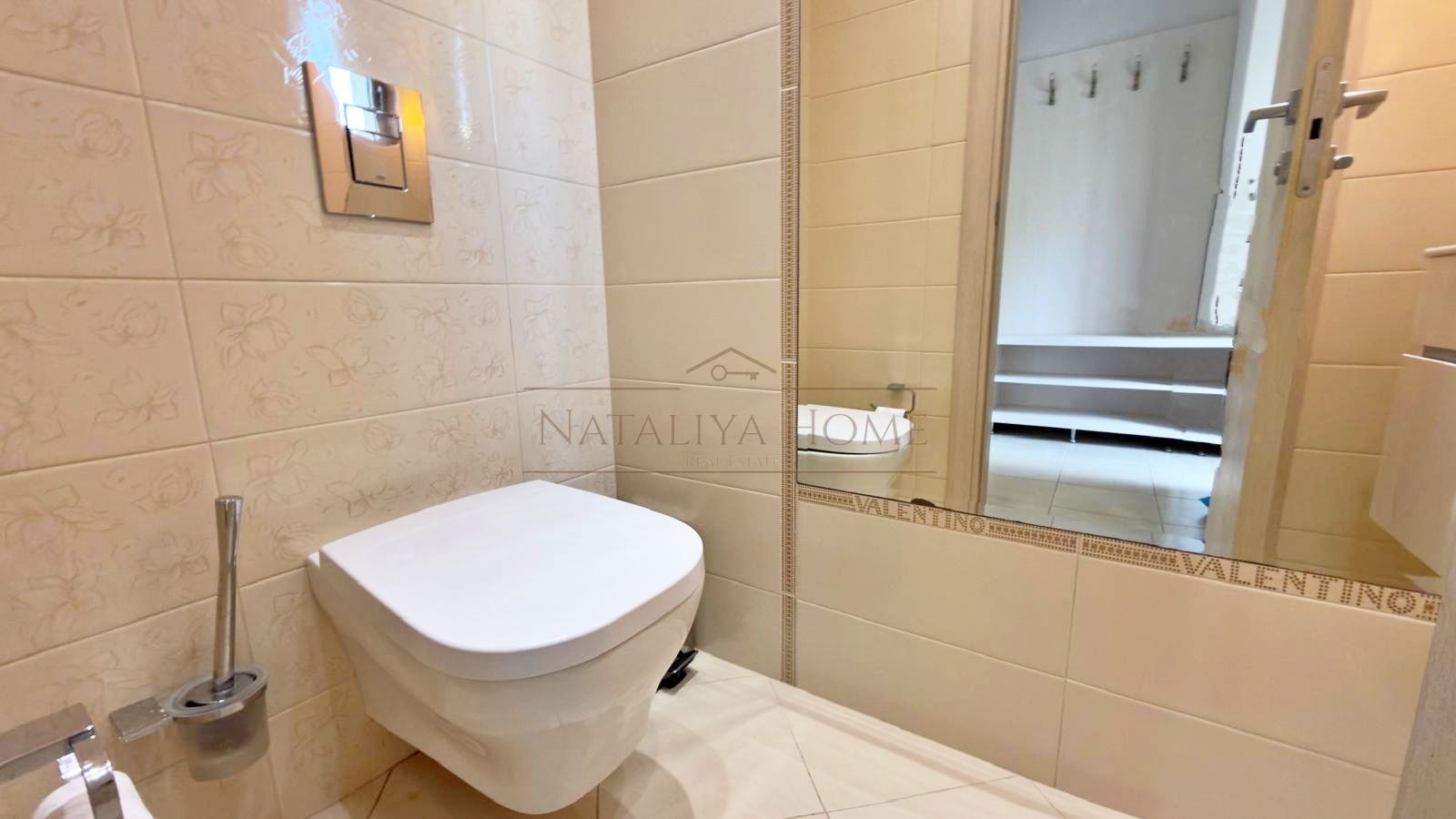 Вътрешно стълбище води към втория етаж, където са разположени две спални родителска и детска, всяка със самостоятелна баня с тоалетна. Родителската спалня разполага и с тераса с гледка към двора. Къщата е напълно обзаведена с нови, стилни мебели и оборудвана с качествени уреди. Интериорът е изпълнен с внимание към детайла, осигуряващ комфорт, уют и усещане за лукс.