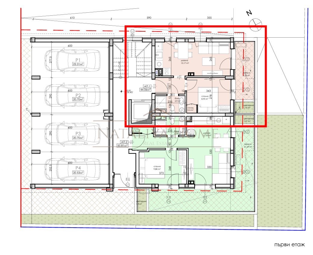 Апартментът е с площ 52,85 кв.м., разположен на партерен етаж. Жилището е с функционално разпределение просторна всекидневна с кухненски бокс и трапезария, уютна спалня, баня с тоалетна и излаз от двете стаи към веранда. Апартаментът се продава на тапа, с възможност довършване до ключ по желание на клиента. Към имота принадлежат и съответните идеални части от поземления имот.