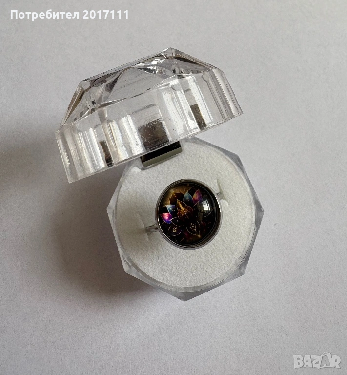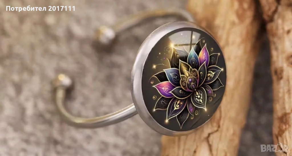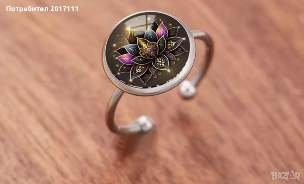 Стилен дамски регулируем пръстен в сребрист цвят с кръгъл медальон и изящен мандала лотос дизайн в златисто и лилаво. Модерно и нежно бижу, подходящо за ежедневие или специален повод.
