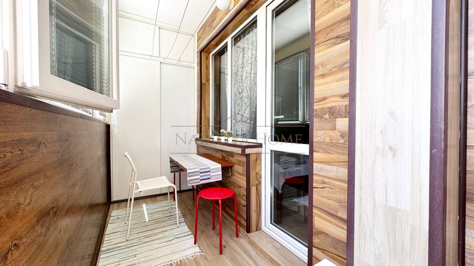 Апартаментът е ситуиран в панелен блок, на първи висок жилищен етаж, с площ от 94 кв.м. и се състои от уютен хол с обособена кухненска част, три самостоятелни спални, две от които с излаз към просторна и слънчева тераса, баня/WC, отделна баня и коридор.