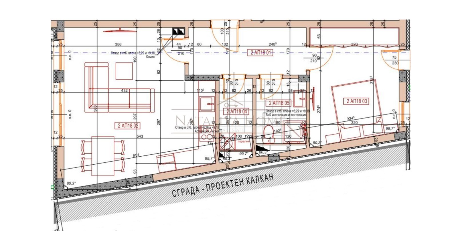 Апартаментът е на трети етаж, с площ от 79,22 кв.м. и се състои от антре, всекидневна с трапезария и кухня, спалня, баня/WC, складово помещение и тераса. Имотът ще бъде издаден на тапа, с възможност за довършване до ключ.
