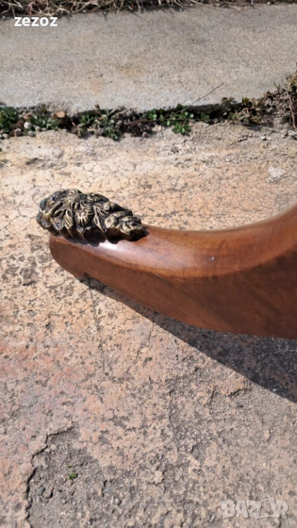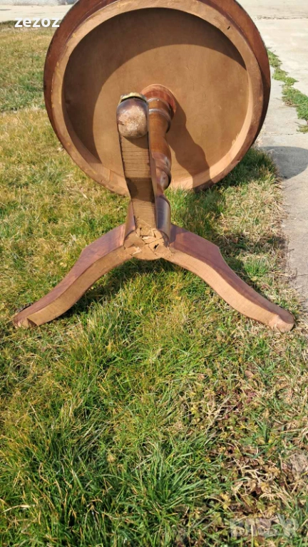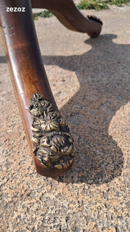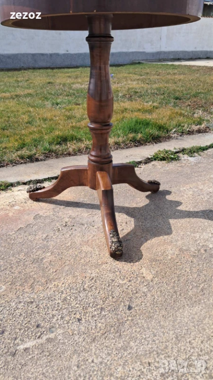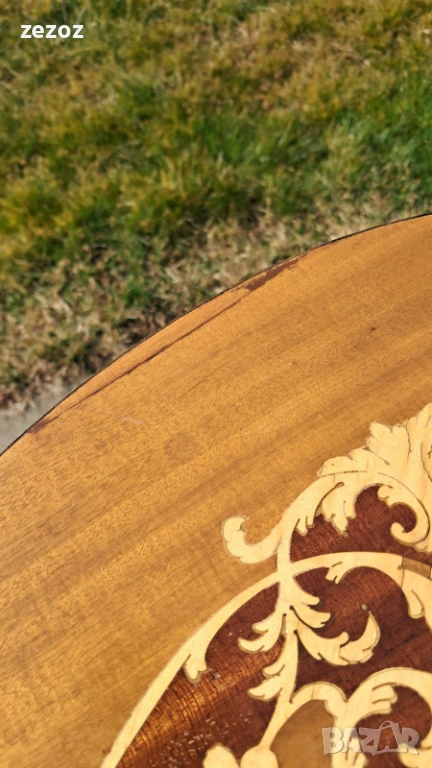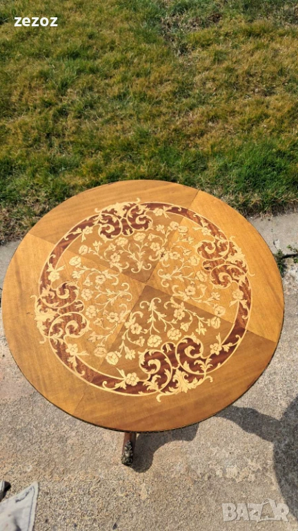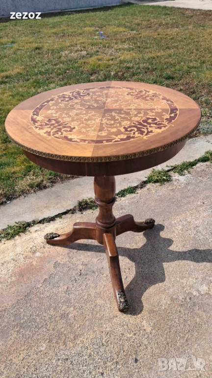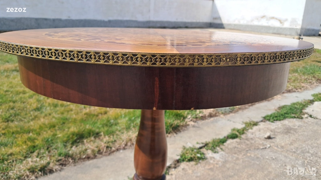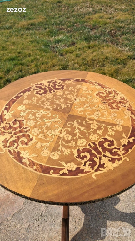 Ретро помощна маса от масив.Плот изработен с техника "маркетри"-различни видове фурнири,оформени за да образуват една картина.Централен пиедестал с три опори украсени с месингови елементи.Борда на плота е оформен с месингова дантела.За годините си масата е добре запазена,конструктивно здрава.Носи си белезите на времето по плота,като стари добре направени поправки и несъвършенства по маркетрията.Размери-