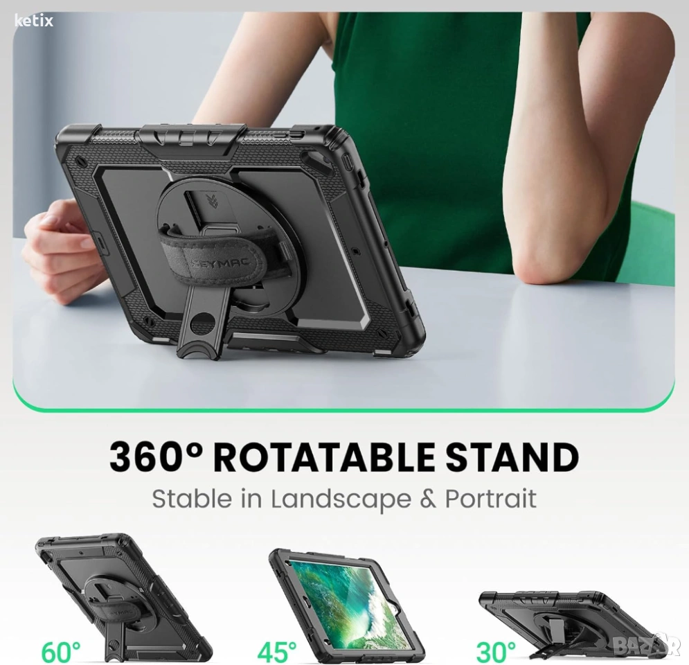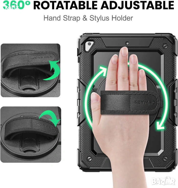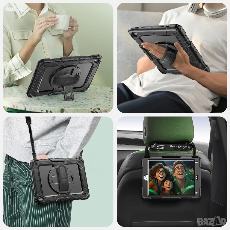 [Каишка за ръка и през рамо]: Регулируемата каишка за ръка осигурява лесен захват и удобно захващане. Регулируемата презрамка осигурява много по-голямо удобство при носене на вашия iPad, когато сте в командировка или на открито. Може да се окачи и на облегалката за глава на колата, за да забавлява пътниците на задната седалка.