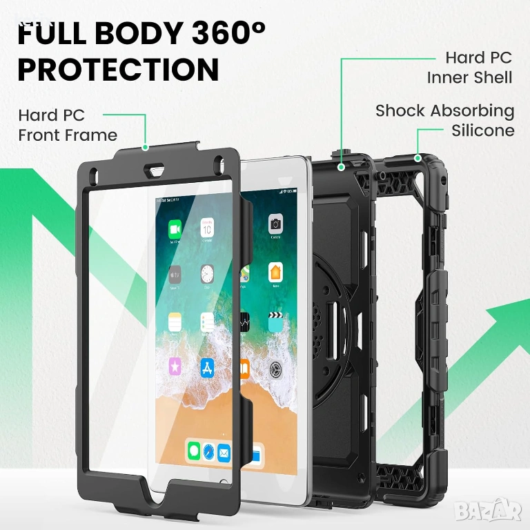 [Пълна защита]: Състои се от вграден протектор за екрана, двуслойни първокласни твърди пластмасови обвивки [горна рамка от PC и вътрешна твърда PC] и гъвкав външен силикон. Този калъф осигурява на вашия iPad пълна защита на тялото срещу случайни удари, падания и драскотини.