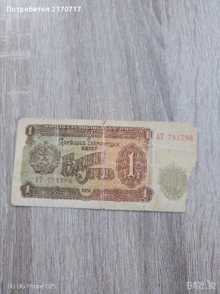 Банкнота 1 лев 1951 година, снимка 1 - Нумизматика и бонистика - 53694103 Банкнота 1 лев 1951 година, снимка 2 - Нумизматика и бонистика - 53694103 1/2