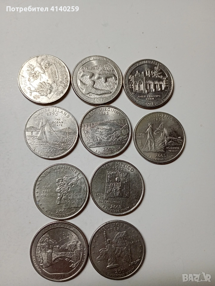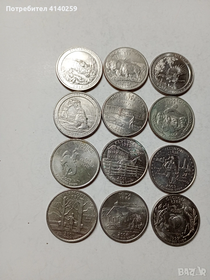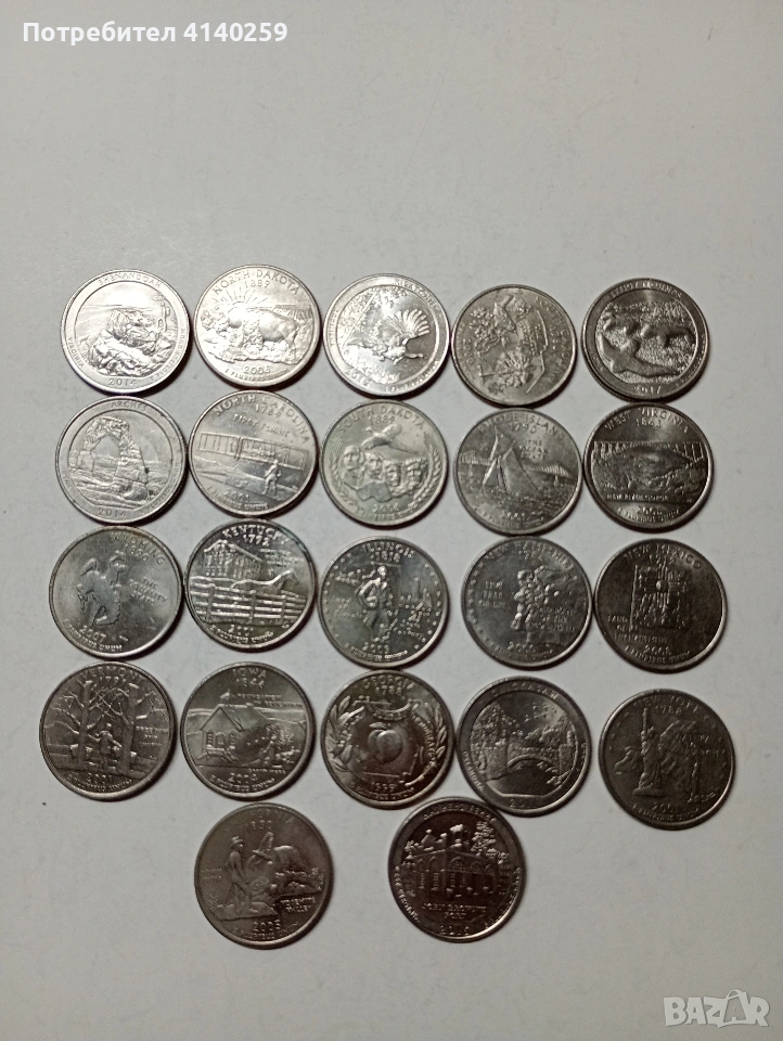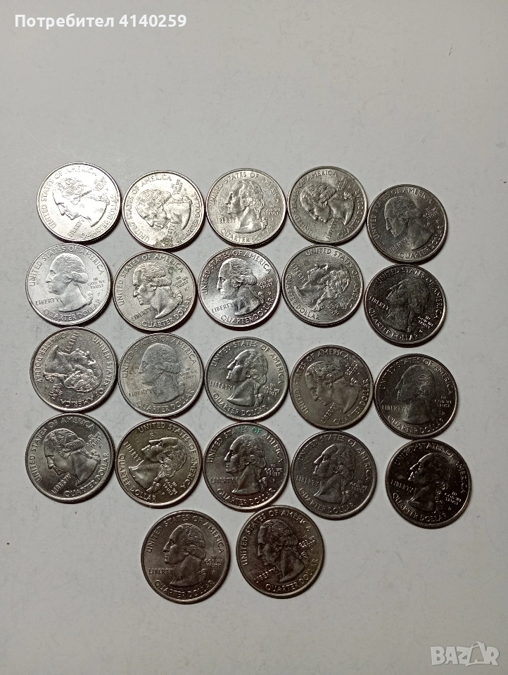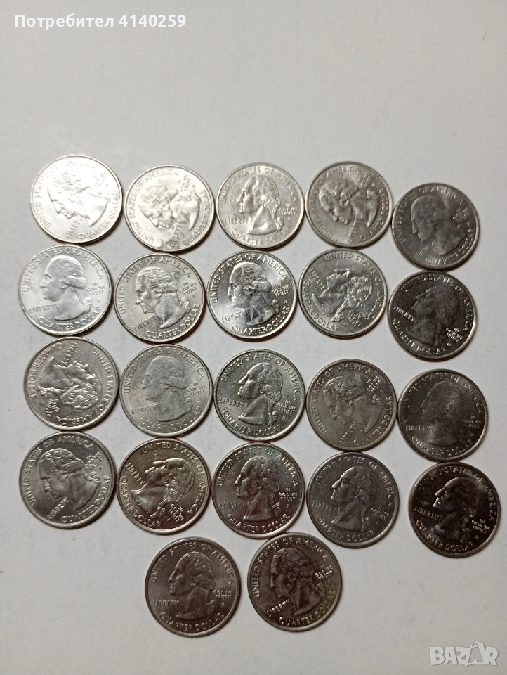 САЩ МОНЕТИ 1/4 КУОРТЪР ДОЛАР ( ЧЕТИ ОПИСАНИЕТО 22 БРОЯ РАЗЛИЧНИ ЩАТА НЯМА ПОВТАРЯЩИ) СЪСТОЯНИЕ ВИДИМО ПОЛУЧАВАТЕ СНИМАНИТЕ МОНЕТИ РАЗГЛЕДАЙТЕ ДРУГИТЕ МИ ОБЯВИ ДА КОМБИНИРАТЕ ДОСТАВКА ЕКОНТ ЗА ВАРНА ЛИЧНО