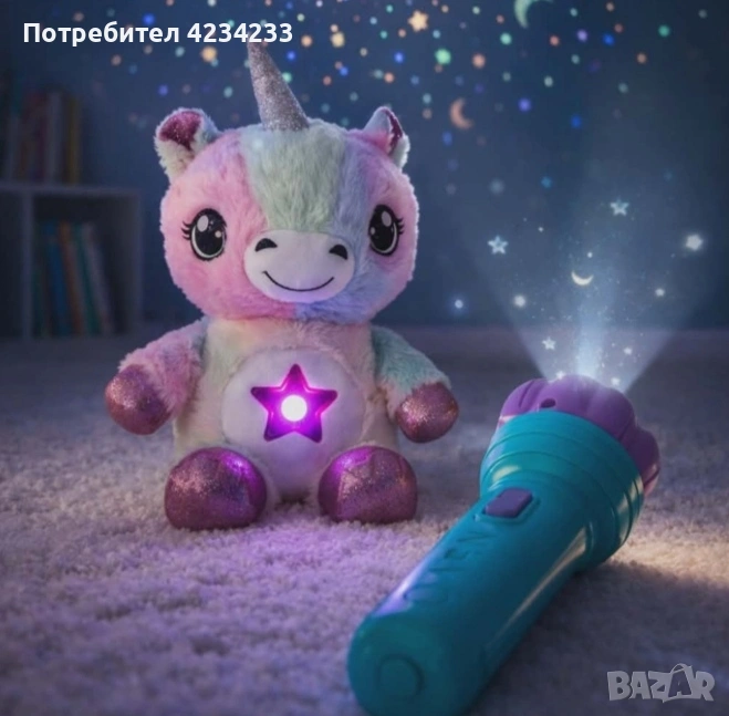 Плюшена играчка и проектор звездно небе еднорог с фенер;