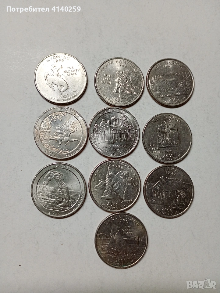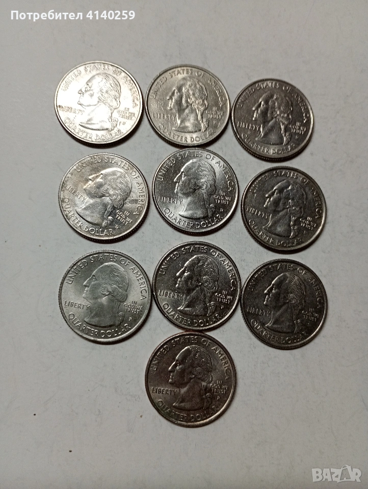САЩ МОНЕТИ 1/4 КУОРТЪР ДОЛАР 10 БРОЯ РАЗЛИЧНИ ЩАТА НЯМА ПОВТАРЯЩИ СЪСТОЯНИЕ ВИДИМО ЦЕНА ЗА 10 БРОЯ ПОЛУЧАВАТЕ СНИМАНИТЕ МОНЕТИ РАЗГЛЕДАЙТЕ ДРУГИТЕ МИ ОБЯВИ ДА КОМБИНИРАТЕ ДОСТАВКА ЕКОНТ ЗА ВАРНА ЛИЧНО