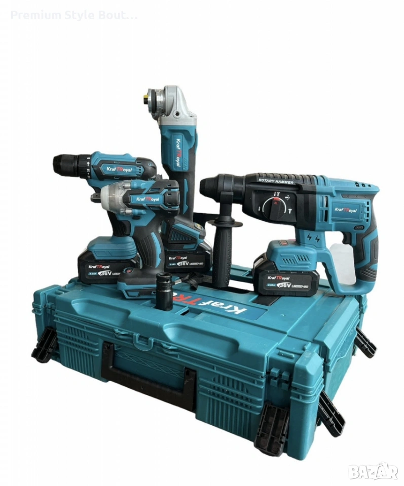 Комплект от акумулаторен перфоратор, ъглошлайф 125 мм, гайковерт и винтоверт 36V с 2 броя батерии