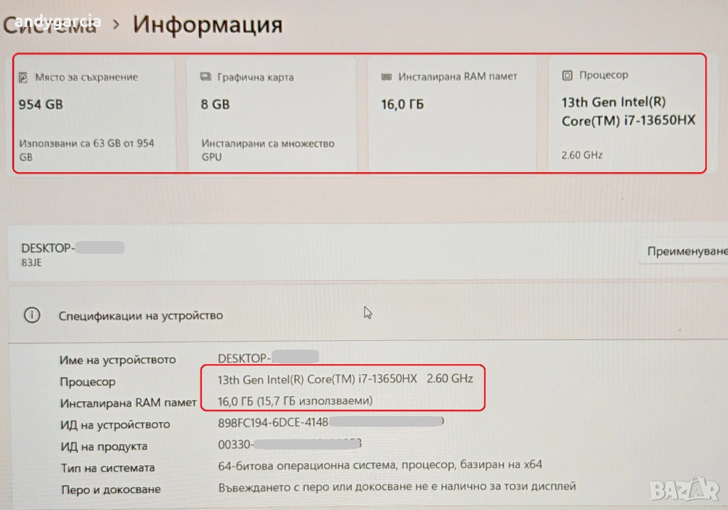 Това е по-скъпата версия с Intel Core i7 - 13650HX, 16GB RAM DDR5