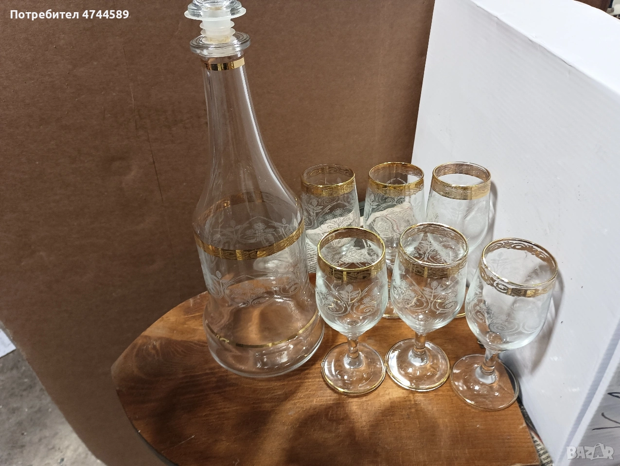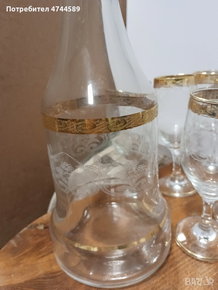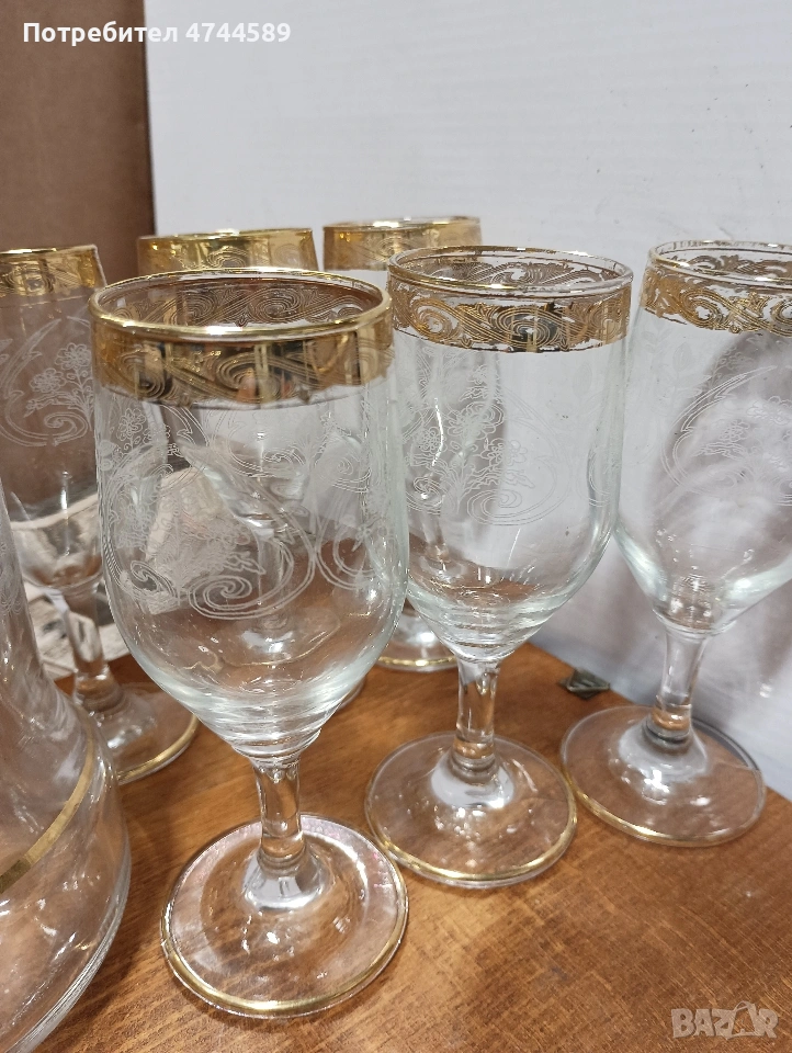 6 чаши и графа. с златна инкрустация и ръчно оформени гравюри. без забележки.