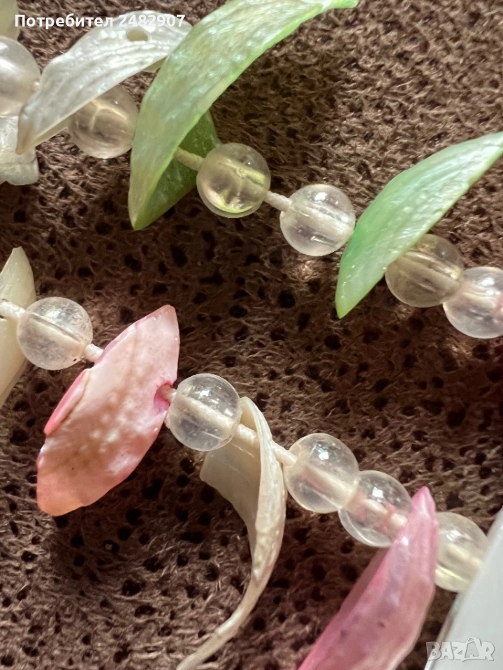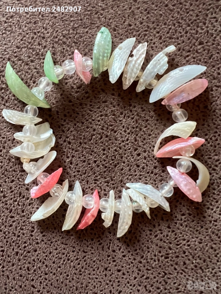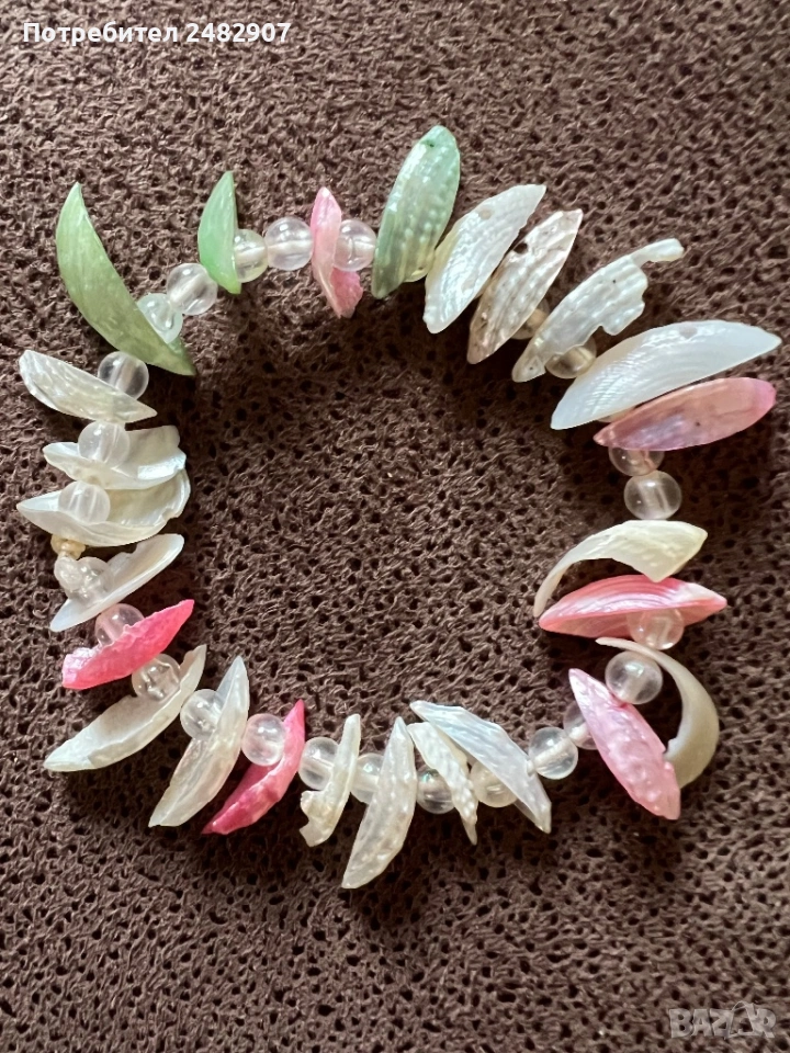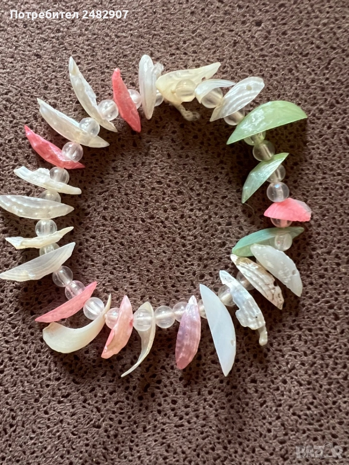 Еластична цветна дамска гривна с прозрачни мъниста и мидени черупки. Диаметър - 6 см. Чисто нова, не е използвана.