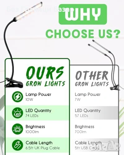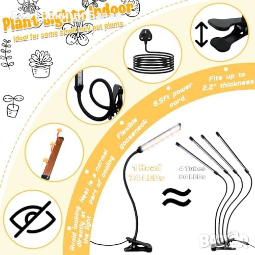 74 LED диода и 1000 lm яркост за силна и равномерна светлина над саксии, разсад и сукуленти