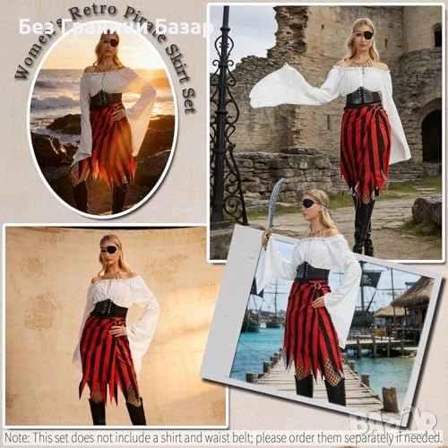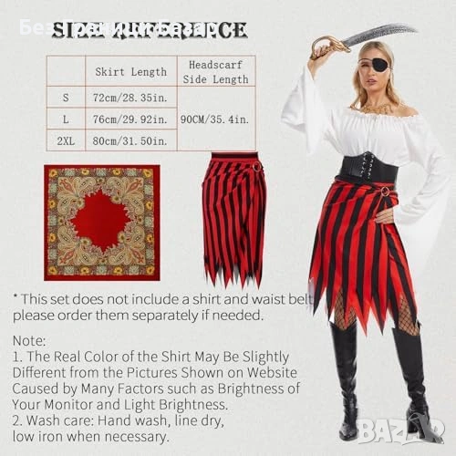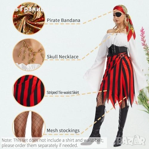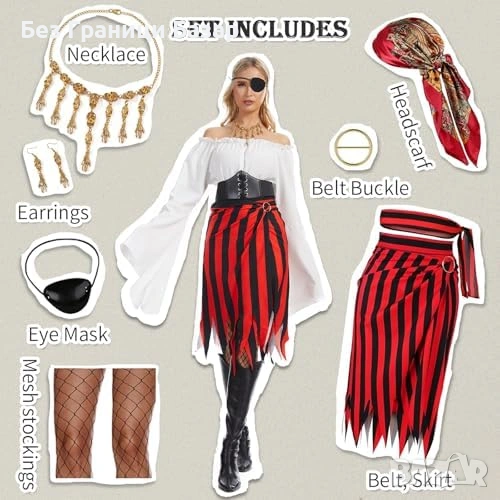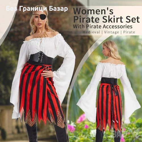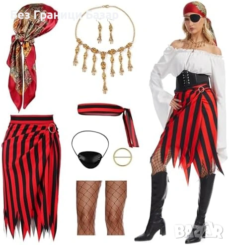 Включва: пиратска пола, бандана, превръзка за око, колие и обеци