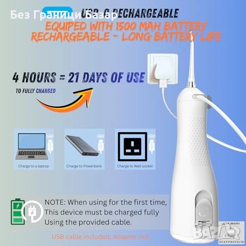 Безжичен и презареждаем воден душ за зъби с 300 ml резервоар за удобно почистване у дома и при пътуване