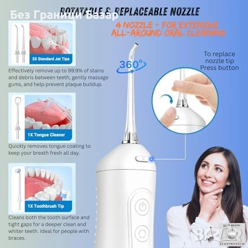 4 накрайника: 2 стандартни струйника, накрайник „четка“ (подходящ за брекети/мостове, може и с паста), накрайник за език за по-свеж дъх