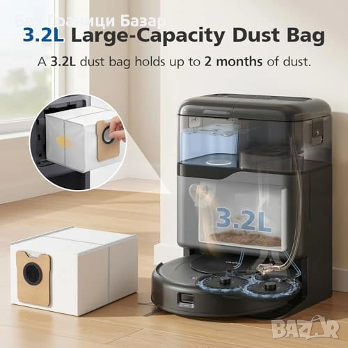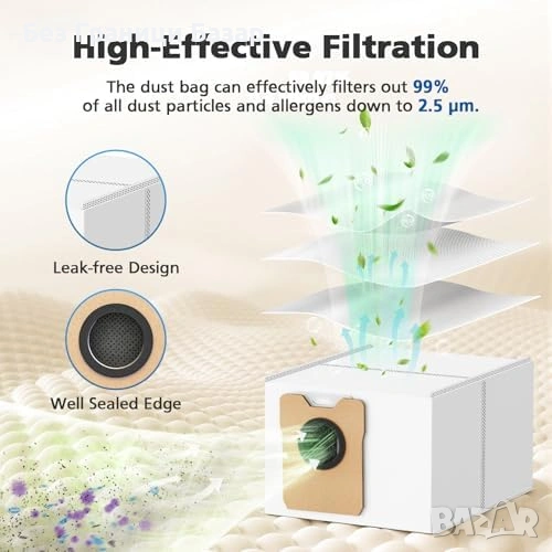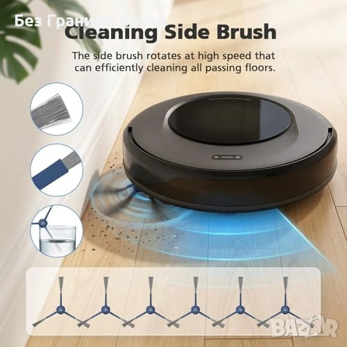 Включва: 2 основни четки, 6 торбички за прах (3.2L), 6 моп кърпи, 4 HEPA филтъра, 6 странични четки