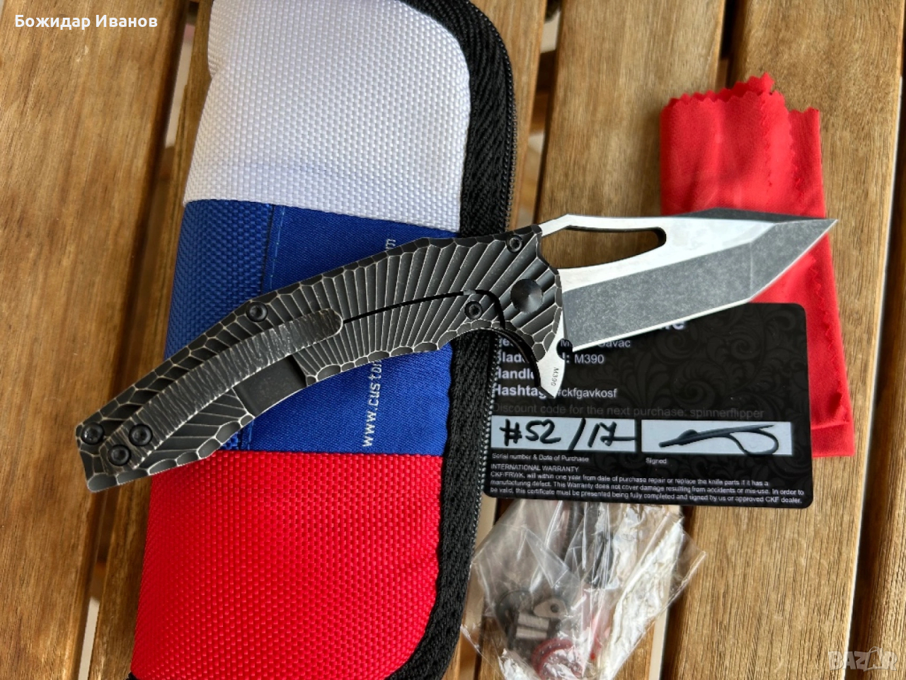 Ножът е чисто нов, от колекция, пълен комплект с пауч, карта, кърпа и резервни части.Всеки, който се е интересувал, знае за качеството на ножпвете на CKF. Намира се в София и се предава лично или по куриер след заплащане.