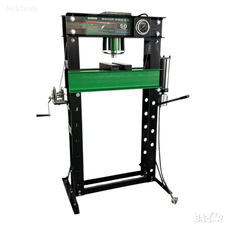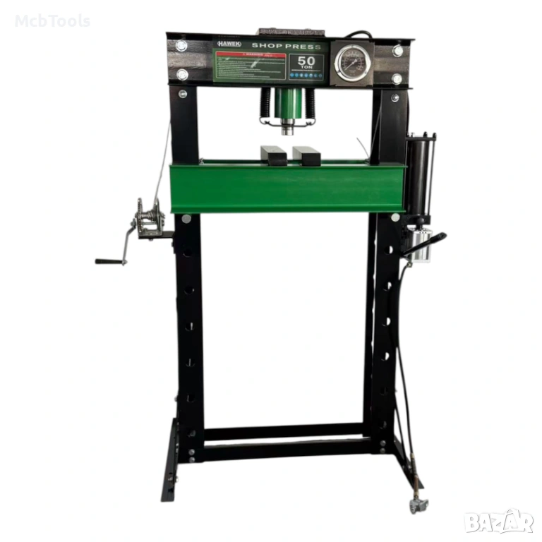 Пневмо-хидравличната подова преса HAWEK 50 тона е високоефективно оборудване, предназначено за професионална работа при пресоване, огъване, монтаж и демонтаж на лагери, втулки и тежки метални детайли. Подходяща е за автосервизи, индустриални предприятия и професионални работилници.