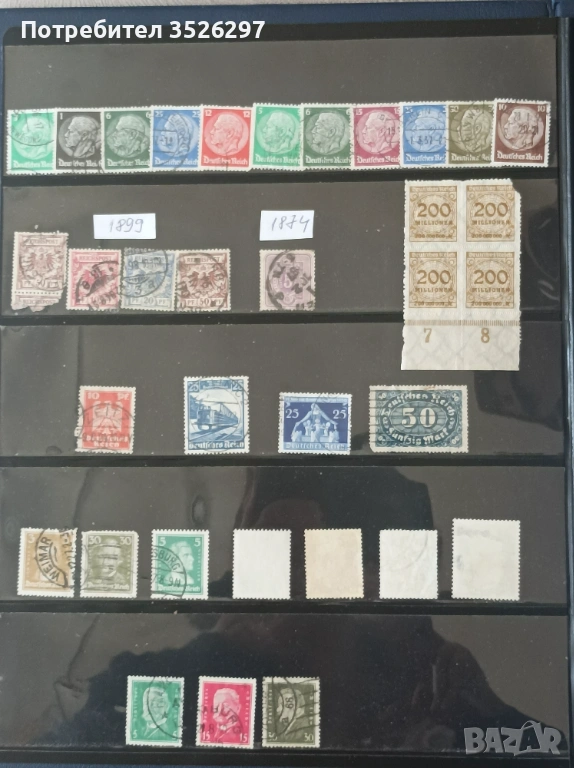 Пощенски марки от Немския райх 34 бр. от периода 1876 - 1941г. Цената е за всичките марки от снимката и е 6 евро. Марките с лика на Хитлер са обърнати.