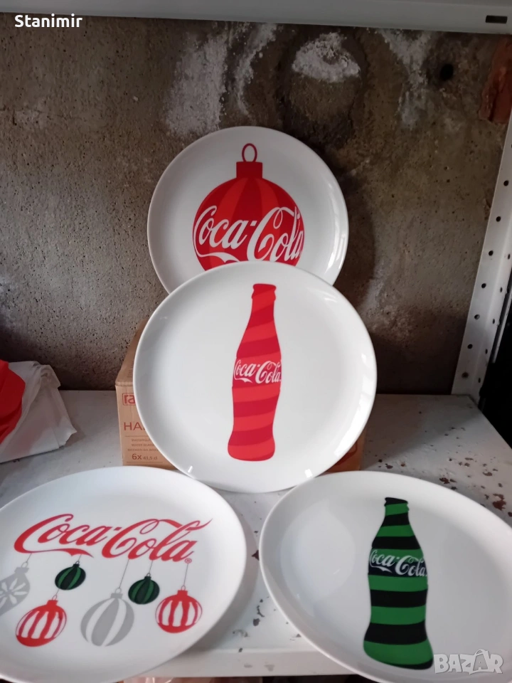 Комплект от 4- броя порцеланови чинии с мотиви на Coca-Cola. Идеални за украса на дома или офиса. Чиниите са с диаметър около 24 см и са в отлично състояние. НОВИ!