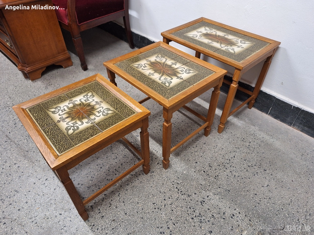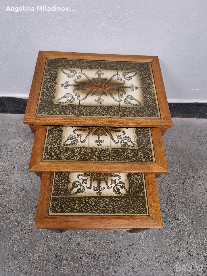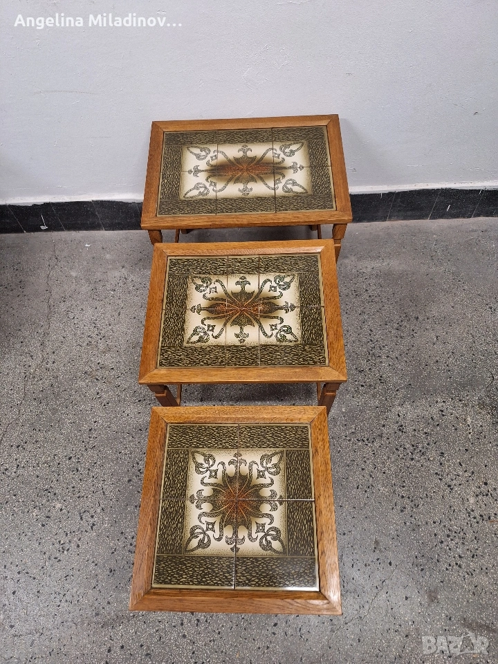 К - т три помощни масички с плочки. Тройка помощни масички с порцеланови плочки, внос от Дания. Трите масички влизат чрез улеи една под друга. Удобни за всекидневна, тераса, веранда или друга част от дома ви. Отлично състояние. Разгледайте и другите ми обяви. Последвайте ни и във фейсбук Мебели шик. Предлагаме и изгоден транспорт за цялата страна. Размери: Голяма - 53/38/46 см. Средна - 45/38/44 см. Малка - 38/38/41 см. Цена - 98 € 191,67 лв. vintagemebel.olx.bg